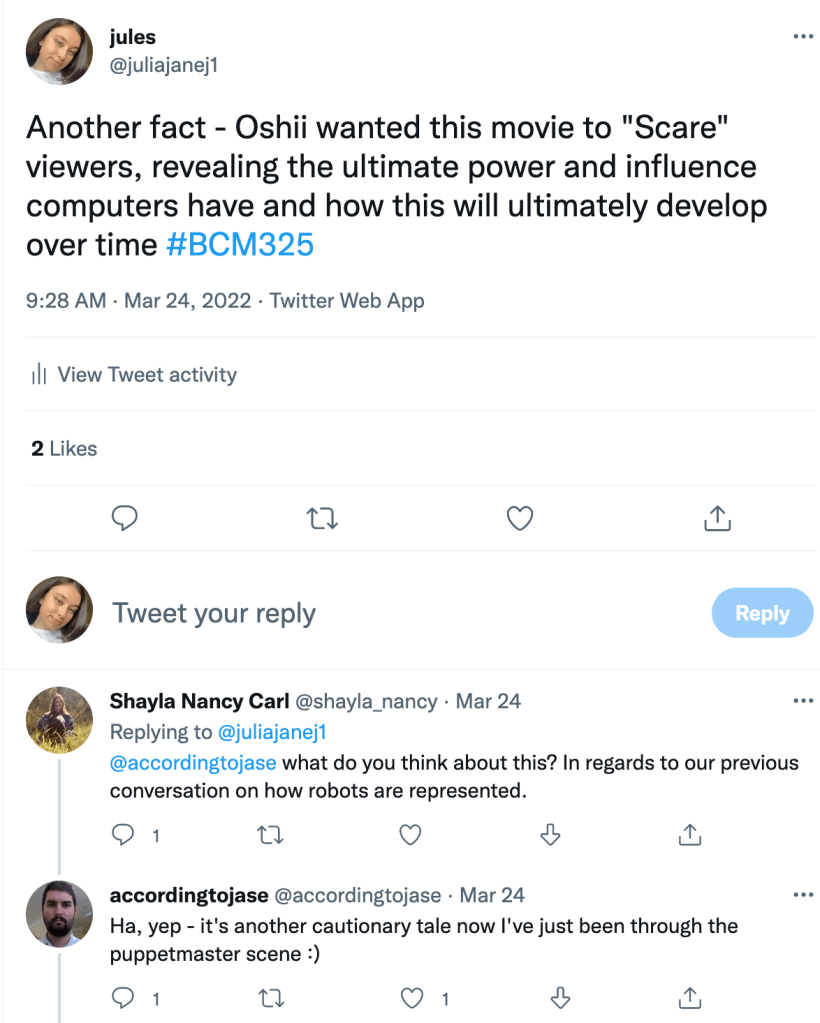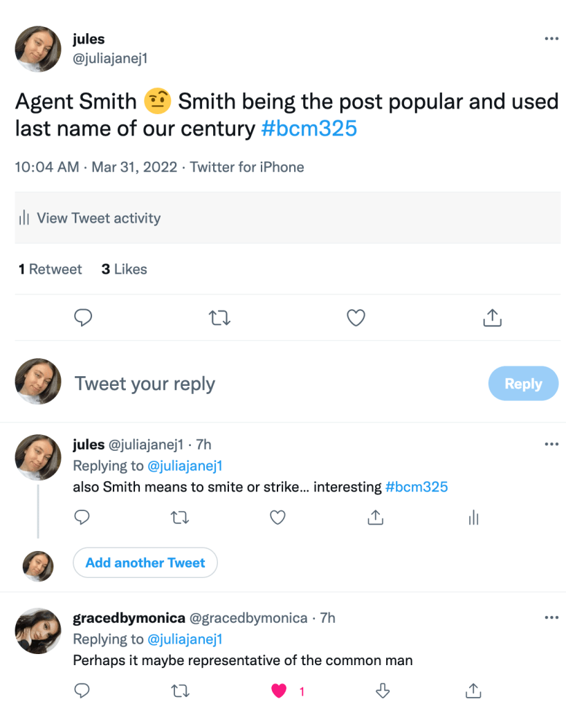 Shalisse and I’s digital artefact was based on prediction in media. Prediction, in the majority, is the word you’d use to associate with the future. We, as people, are constantly predicting what is going to happen next. With this is mind, the introduction of media has astonishingly predicted real-life events and trends. These media types include tv shows, music, film and games. Dissecting each of these chosen media, we made 4 videos to break down a chosen example of each media. We used a helpful quote I had learnt from a lecture in BCM325 titled “Artificial Intelligence: Predictions and Revolutions”, the quote read “Some predictions, are actually observations” (Moore, 2022).