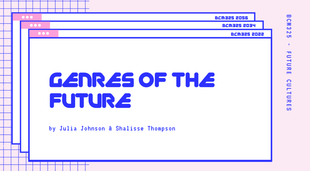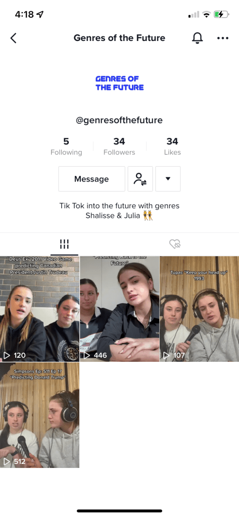 Throughout this semester in BCM325, Shalisse Thompson and I have curated content on ‘TikTok’, a popular social media platform that allows you to produce short videos following trends and popular sounds. On TikTok, we made 2-3 minute podcast styled videos on our very own account titled “Genres Of The Future”, in each of these videos we discussed how different forms of media such as music and film predicted future trends and events. I personally had previously made videos on TikTok for BCM112, BCM114, BCM215 and BCM206. With this previous knowledge and understanding as well as Shalisse’s love for Tiktok, it was easy to transition onto this platform and begin to make our videos. Despite this easy transition, both of us found it quite difficult to find a topic and idea to base our digital artefact on originally. We bounced around between making a podcast and talking purely about music and the future of music. Both of us had opposite ideas and debated (quite a lot) on what we were going to do. Eventually combining both ideas, we concluded creating content on a platform we both loved whilst discussing in a podcast format and occasionally talking about music. Compromising as a duo helped us grow together throughout this subject as well as develop new skills such as working coherently as a team.